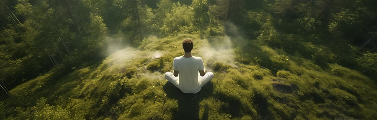 Meditating figure in lotus pose with swirling energy, representing mindfulness exercises.
